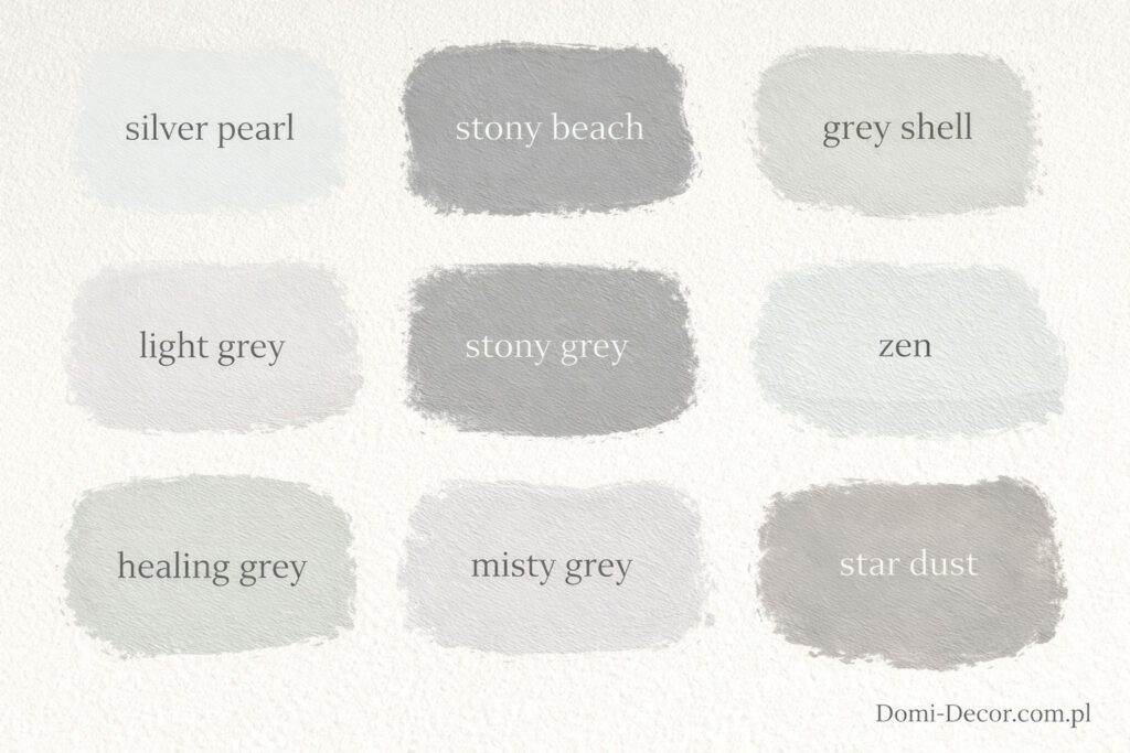 Każdy kolor, nawet kolor szary zawiera w sobie również inne pigmenty. Przyglądając im się uważnie zauważyć można, że kolory silver pearl i zen mają w sobie sporo niebieskiego – są to zatem najchłodniejsze odcienie, które doskonale rozświetlą wnętrze i dodadzą rześkości. Kolory healing grey, stony beach oraz grey shell są pochodnymi zieleni. Nie rozświetlają; więc nie są odpowiednie do wnętrz z małym dostępem światła dziennego. Decydując się na stony beach zastanowić się należy czy aby na pewno chcemy pomalować nim wszystkie ściany, ponieważ może przytłoczyć wnętrze (a nie zawsze jest to efekt zamierzony). Stony grey i star dust to odcienie, które w sobie mają przemycone nieco brązu – będą się ciekawie komponować z dodatkami w kolorze naturalnego lnu i beżu oraz pasteli. Na koniec zostawiłam moich faworytów light grey oraz misty grey. Są to odcienie bardzo bezpieczne i najdosłowniej oddają ideę koloru szarego – świeżość, spokój, wdzięk, klasa i ponadczasowość.